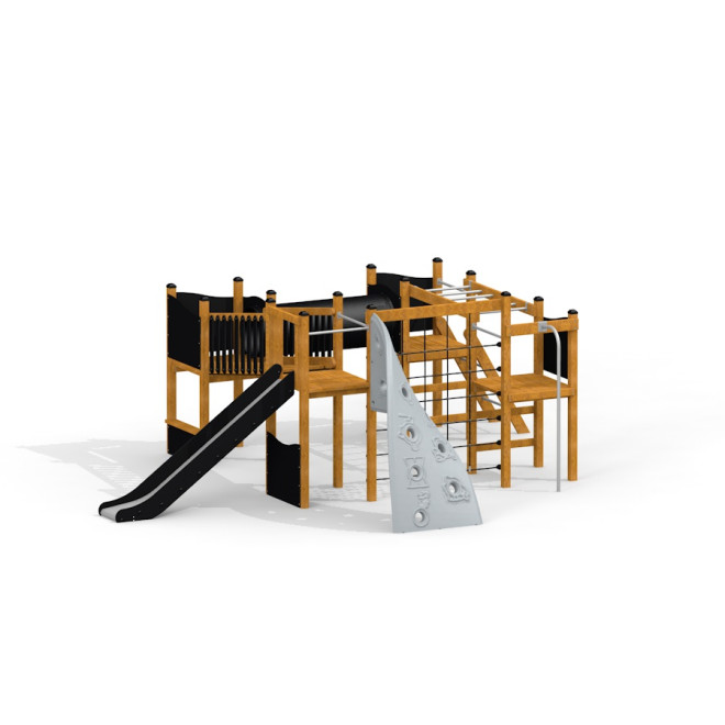 Perfect pentru parcuri, grădini școlare sau zone de joacă comunitare, acest ansamblu încurajează activitatea fizică și dezvoltarea abilităților motrice. Designul său natural se integrează armonios în medii exterioare, oferind un spațiu atractiv și funcțional pentru copii.
