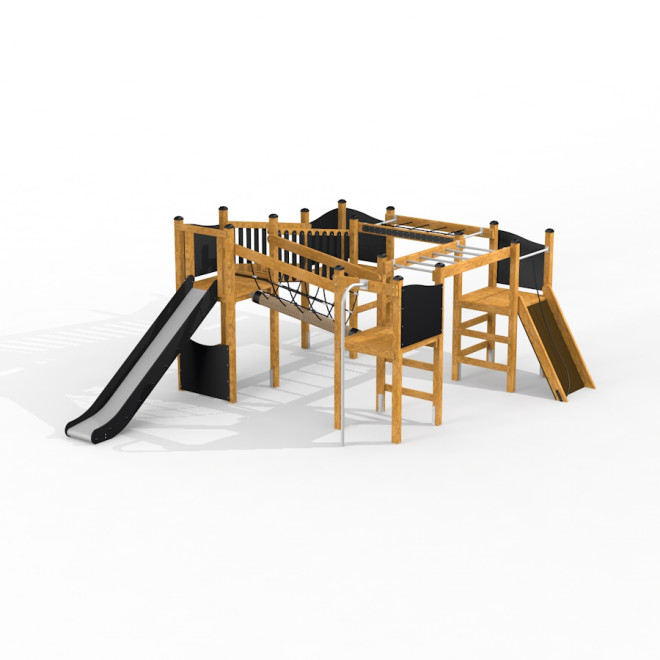 Construcția robustă utilizează lemn de larice, oțel inoxidabil și oțel galvanizat, asigurând durabilitate și rezistență în timp. Elementele din HDPE reciclat, frânghiile din PP întărit și placajul antiderapant și impermeabil sporesc siguranța și confortul în utilizare, iar componentele din PE completează echipamentul cu finisaje rezistente la intemperii.