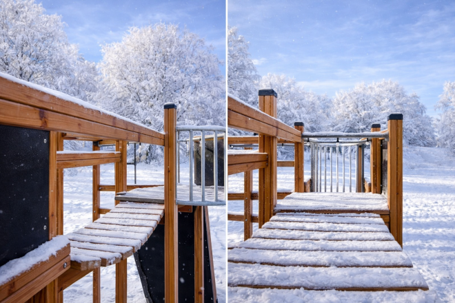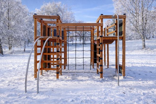 Construcția robustă a Climbing Booth Nature este realizată din lemn de larice, o alegere durabilă și rezistentă la intemperii, completată cu componente din oțel inoxidabil și oțel galvanizat pentru o stabilitate sporită. Materialele plastice reciclate HDPE, precum și frânghii din PP întărit și moale, adaugă un plus de siguranță și confort. Plăcile de placaj antiderapante și impermeabile asigură o utilizare sigură în orice condiții meteorologice.