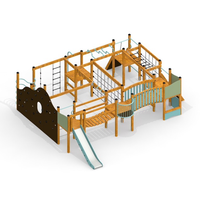 Structura este realizată din lemn de larice, un material natural și rezistent, completat de elemente din oțel inoxidabil și oțel galvanizat pentru durabilitate sporită. Componentele din HDPE reciclat și plăcile din placaj impermeabil antiderapant asigură siguranță și rezistență în timp, iar corzile din PP, atât întărite cât și moi, adaugă un plus de funcționalitate și confort.