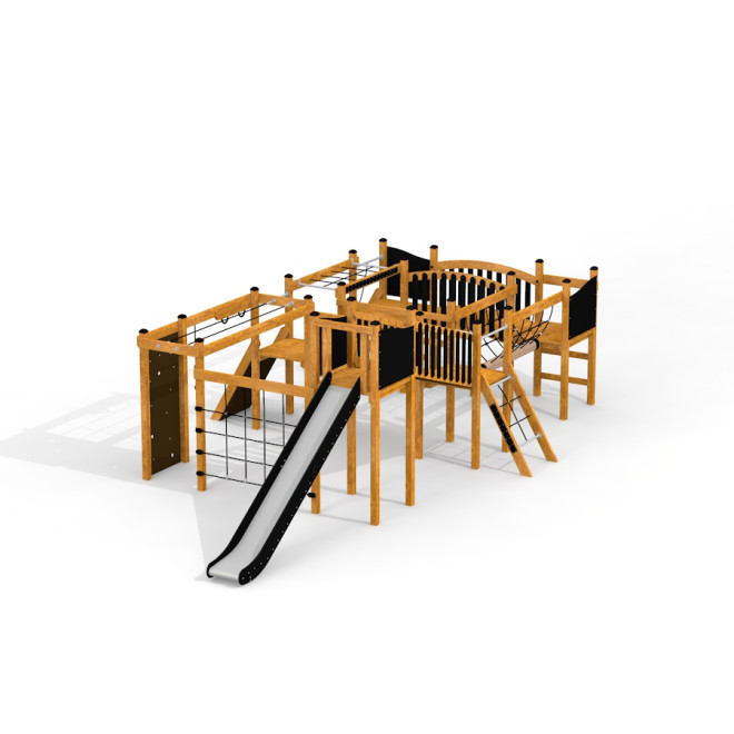Acest castel de joacă este realizat din lemn de larice de înaltă calitate, combinat cu oțel inoxidabil și oțel galvanizat, asigurând o rezistență superioară în orice condiții meteo. Elemente precum HDPE reciclat, plăci din placaj rezistent la apă și frânghii din polipropilenă întărită și moale oferă durabilitate și siguranță, menținând în același timp un aspect natural și prietenos pentru copii.