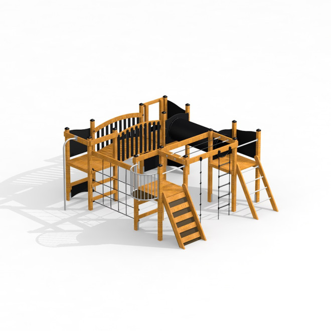 Realizat din lemn de larice, oțel inoxidabil și oțel galvanizat, acest echipament combină durabilitatea cu estetica naturală. Elemente precum frânghii din polipropilenă întărită și moale, precum și placaj impermeabil antiderapant, asigură un plus de confort și funcționalitate. Materialele reciclate HDPE și componentele din PP și PE sporesc rezistența în timp și protejează mediul înconjurător.